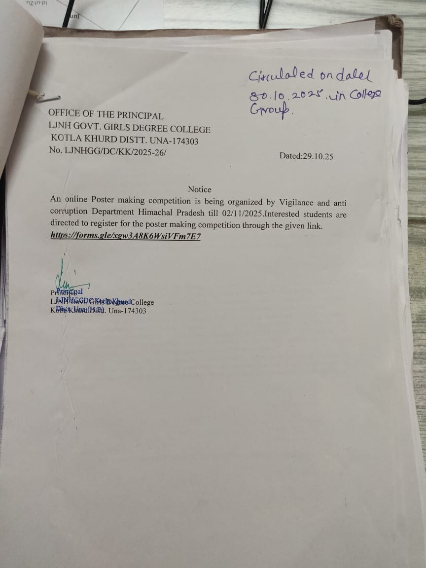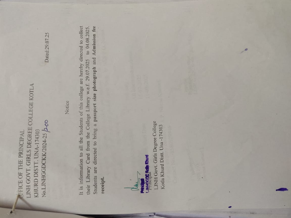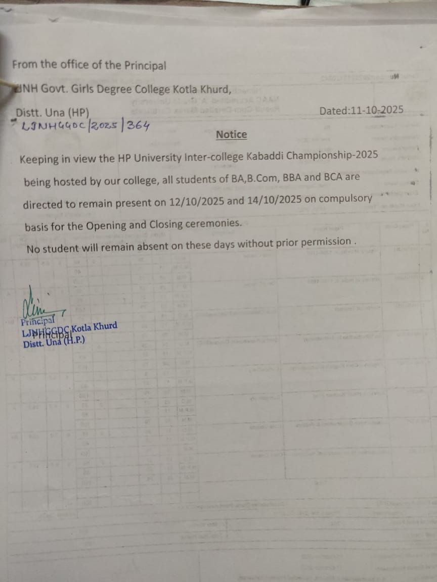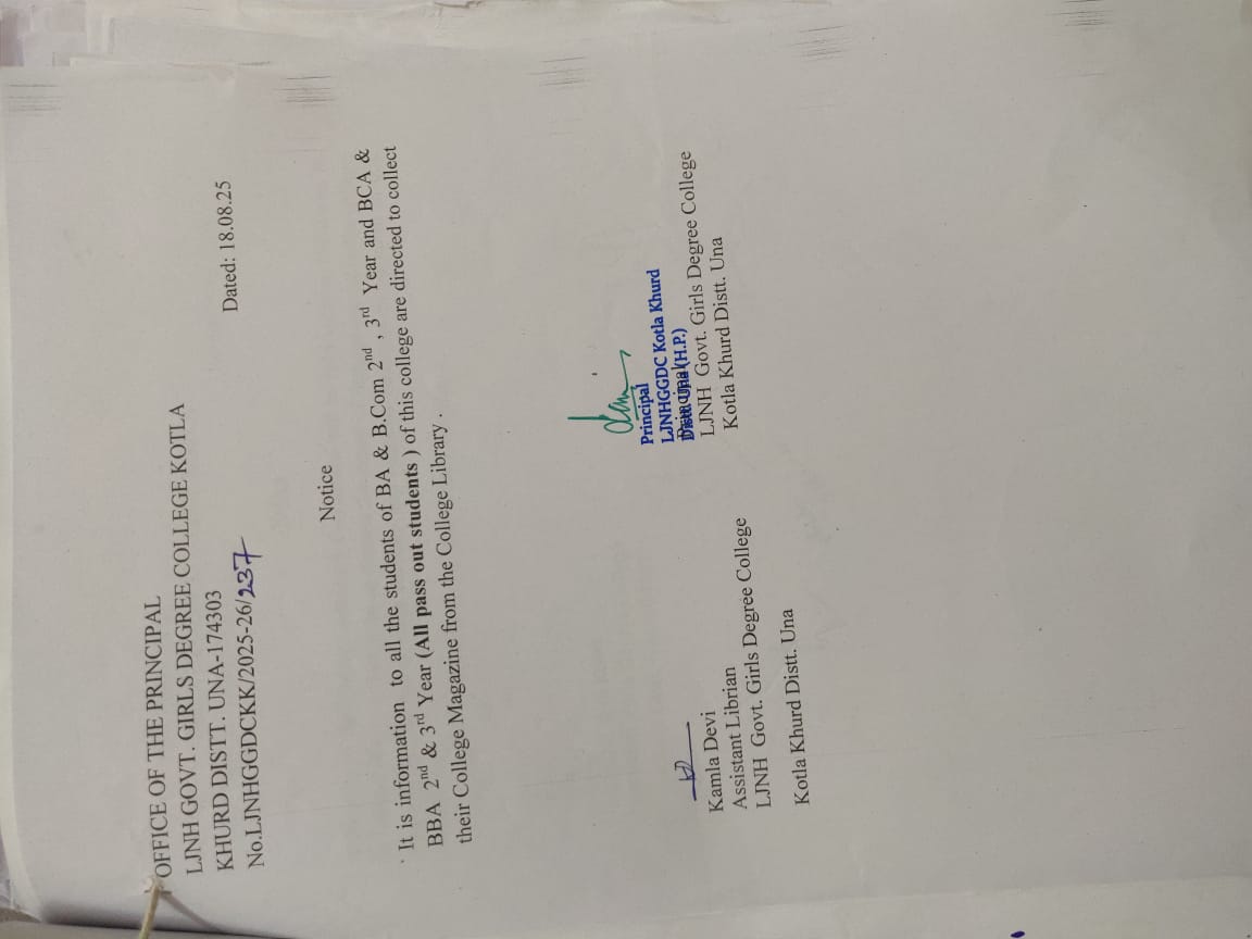 Govt. Degree College Kotla Khurd came into existence on 29th July,2020 when the Government of Himachal Pradesh took over the erstwhile LJNH Kanya Mahavidyalya,which was an intiative of Himotkarsh Parishad. The journey began in 2004 with the noble objective of providing Higher Education in secure environment for Girls. Thousands of Girls have passed out since then many of them have made their alma mater proud with their accomplishments. the college inspires our students to embody the virtues of true soldiers, defending and preserving our cherished traditions and culture. It holds a special place in the hearts of our alumni, who fondly remember their alma mater. Offering education in Arts, Commerce, BCA, BBA, A PG Diploma in comuter Applications is also available for the interesting students.our institution is dedicated to nurturing students’ recognition of the divine within themselves and others, fostering respect for the dignity and uniqueness of each individual. We prioritize quality education, discipline, and holistic personal development, supported by our dedicated faculty and staff.