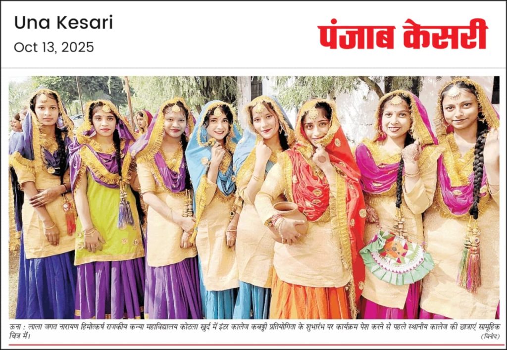 आज लाला जगत नारायण हिमोत्कर्ष राजकीय कन्या महाविद्यालय कोटला खुर्द में केंद्रीय छात्र संगठन के द्वारा सांस्कृतिक कार्यक्रम आयोजित किया गया। जिसमें मुख्य अतिथि श्री विवेक शर्मा, विधायक कुटलेहड विधानसभा क्षेत्र उपस्थित हुए। इस कार्यक्रम में ऊना जिला से राजकीय महाविद्यालय उन्ना, खडड, वीटन,  बंगाना, हरौली, भटोली  के छात्रों ने सांस्कृतिक प्रस्तुतियां दी। सांस्कृतिक प्रस्तुतियों ने सभी का मन मोह लिया। महाविद्यालय के प्राचार्य डॉ राज कुमार ने मुख्य अतिथि तथा अन्य सभी गणमान्य व्यक्तियों का स्वागत व अभिनंदन किया। श्री विवेक शर्मा ने अपने वक्तव्य में कहा की हिमाचल प्रदेश सरकार के द्वारा छात्राओं के कल्याण के लिए विभिन्न योजनाएं शुरू की हैं। उन्होंने महाविद्यालय महाविद्यालय के लिए ₹5 लाख की राशि स्वीकृत की तथा सांस्कृतिक गतिविधियों में भाग लेने वाले बच्चों के लिए ₹11000 की राशि दी। इस अवसर पर विधायक विवेक शर्मा जी की धर्मपत्नी श्रीमती मृदुल शर्मा, राजकीय महाविद्यालय खड के प्राचार्य डॉ आर के शर्मा,  डा मीता शर्मा, डॉक्टर बलविंदर राना, डॉक्टर एस के बंसल, ब्लॉक कांग्रेस अध्यक्ष श्री राम आसरा, स्थानीय पंचायत की प्रधान श्रीमती ममता रानी, स्टाफ के सदस्य और कई गण मान्य व्यक्ति उपस्थित रहे। महाविद्यालय के उप प्राचार्य डॉ रमन जसवाल ने कार्यक्रम में धन्यवाद प्रस्ताव पेश किया।